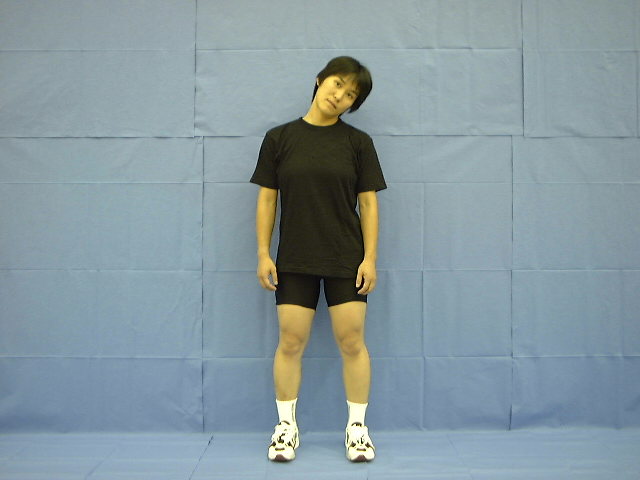 (意識する部位)・首全体の筋の伸展(説明文) ・足を肩幅に開いて、肩の力を抜きます。 ・首を前・右・後・左と2つずつ数えながら ゆっくりと回します。 ・左右交互に2回繰り返しましょう。 |