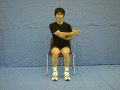 (意識する部位)・肩の外側 ・腕のつけ根 ・背中(説明文) ・イスに腰掛け、背すじを伸ばします。 ・片方の手を胸の前に伸ばし、逆手で下から肘 を持ち、胸の方へ引き寄せます。 ・肩と肩甲骨の周辺を伸ばしましょう。 |